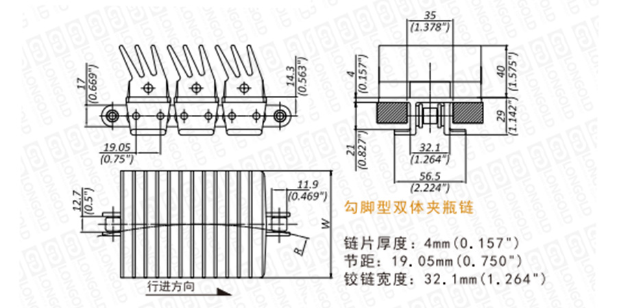 免加油自潤滑鏈條無需定期潤滑,多種規(guī)格的橡膠墊為每一種具體的應(yīng)用施加理想可控的作用力,由滾花的奧氏體不銹鋼銷軸構(gòu)成鏈片和夾爪的可靠系統(tǒng)。EW1873T系列鏈條為勾腳型雙體夾瓶鏈。鏈片為塑料材質(zhì),鏈片上有橡膠材質(zhì)的長齒,長齒結(jié)構(gòu)在發(fā)生彎曲變化時(shí)不會對產(chǎn)品和傳送線增加壓力,適合于輸送空玻璃容器類產(chǎn)品。