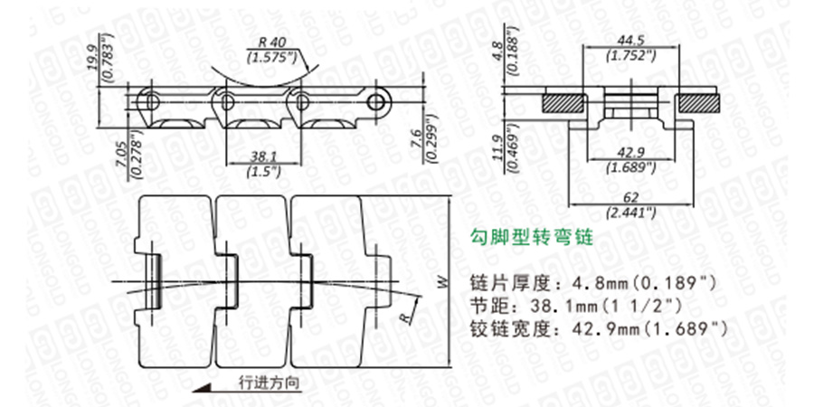 上圖為879T系列轉(zhuǎn)彎鏈的結(jié)構(gòu)圖,圖紙已標(biāo)明本體尺寸。