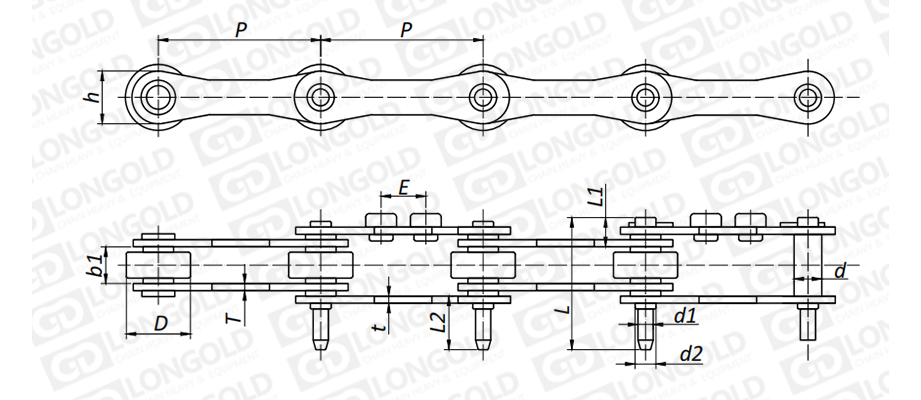 鏈板為特殊鏈板,帶GNA2附件,即一側(cè)鏈板上帶有兩個(gè)孔的中孔附件;同時(shí)鏈條帶錐型延長銷。