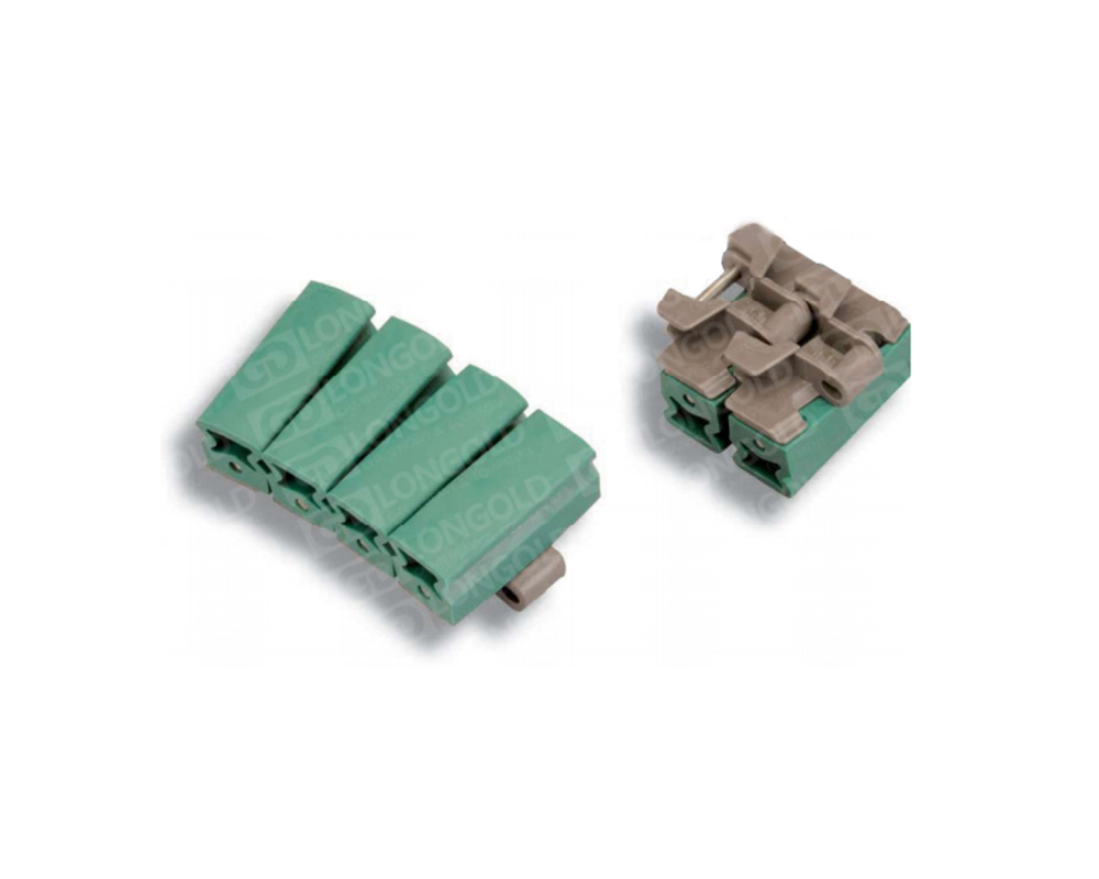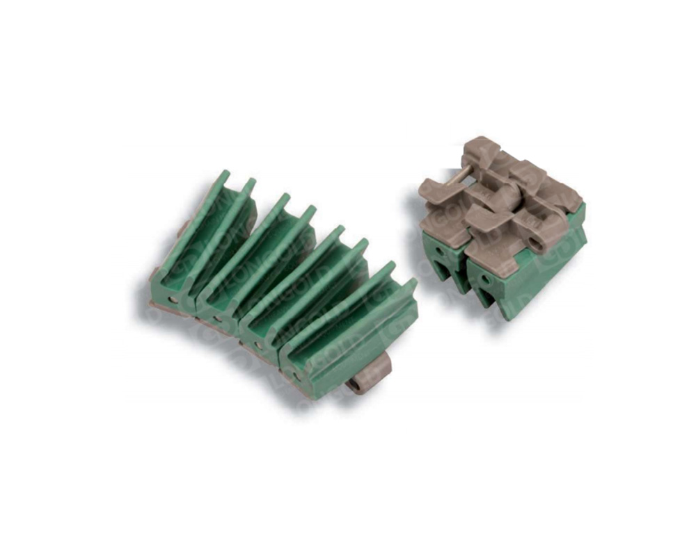 GD878T系列鏈條為勾腳型單體夾瓶鏈。鏈條轉(zhuǎn)彎半徑縮小為250毫米。鏈片為塑料材質(zhì),鏈片上有“D”型橡膠,能現(xiàn)橡膠墊和待輸送的產(chǎn)品之間的平穩(wěn)持續(xù)的接觸。由于橡膠墊特定的截面,被輸送的產(chǎn)品始終處于受控狀和均一穩(wěn)定狀態(tài)下,而且這種受控和穩(wěn)定的狀態(tài)是雙向的